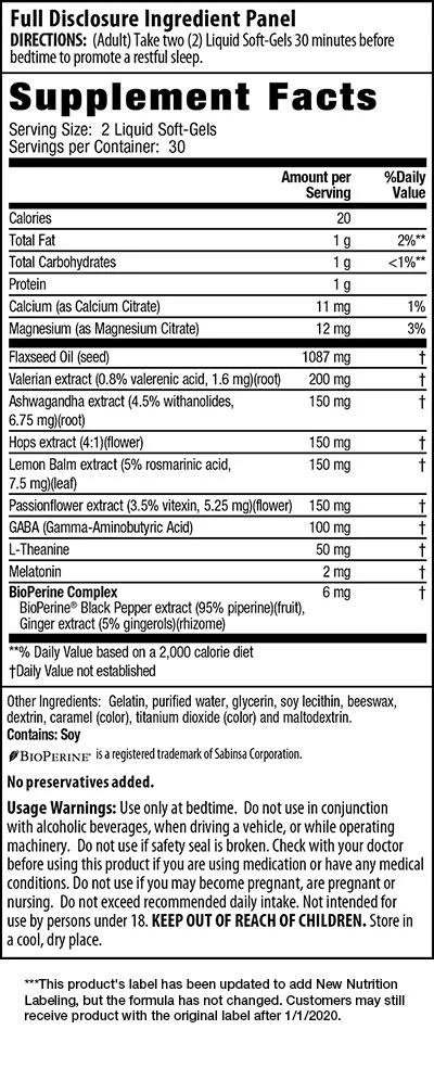 Calcium (as Calcium Citrate) 11 mg 1%, Magnesium (as Magnesium Citrate) 12 mg 3%, Flaxseed Oil 1087 mg, Valerian extract (0.8% valerenic acids, 1.6 mg)(root) 200 mg, Ashwagandha extract (4.5% withanolides, 6.75 mg)(root) 150 mg, Hops extract (4:1)(flower) 150 mg, Lemon Balm extract (5% rosmarinic acid, 7.5 mg)(aerial) 150 mg, Passionflower extract (3.5% vitexin, 5.25 mg)(flower) 150 mg, GABA (Gamma-Aminobutyric Acid) 100 mg, L-Theanine 50 mg, Melatonin 2 mg, BioPerine Complex (BioPerine® Black Pepper extract (95% piperine)(fruit), Ginger extract (5% gingerols)(rhizome)) 6 mg