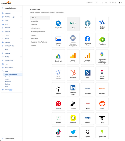 With Cloudflare Zaraz you load analytics tools, advertising pixels, widgets, and other third-party tools in your Canva Website.