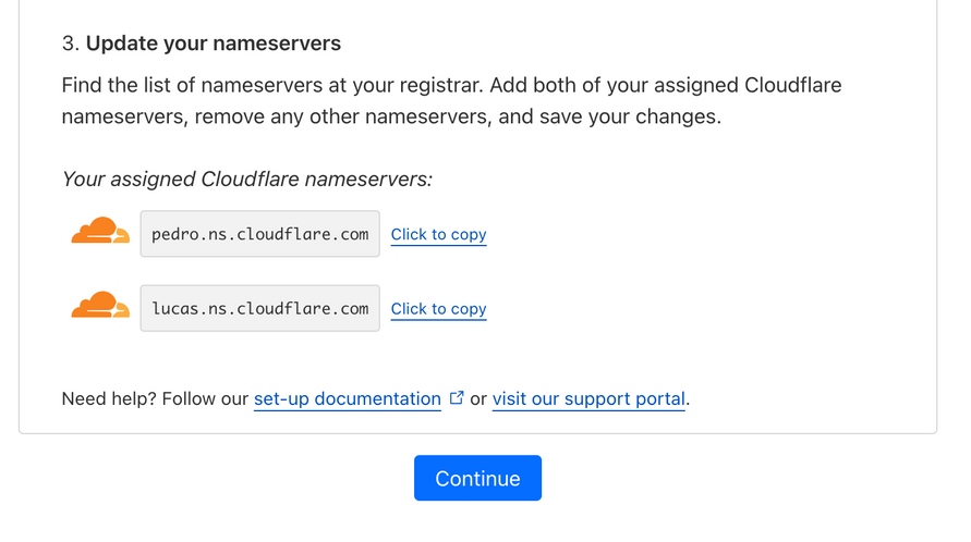 Before your domain can begin using Cloudflare for DNS resolution, you need to add these nameservers at your registrar.
