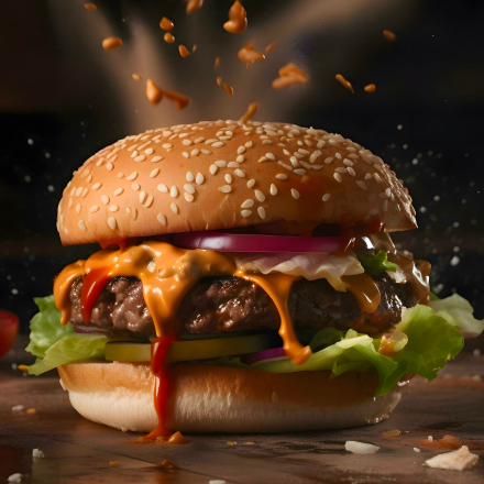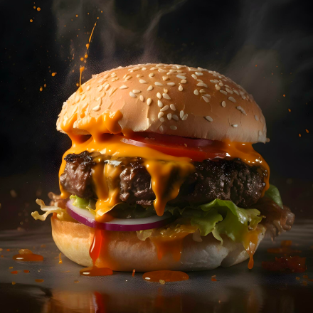 Pão de brioche com hambúrguer bovino (180g), picles, onion rings, tomate confitado, alface, bacon, queijo cheddar e fritas.